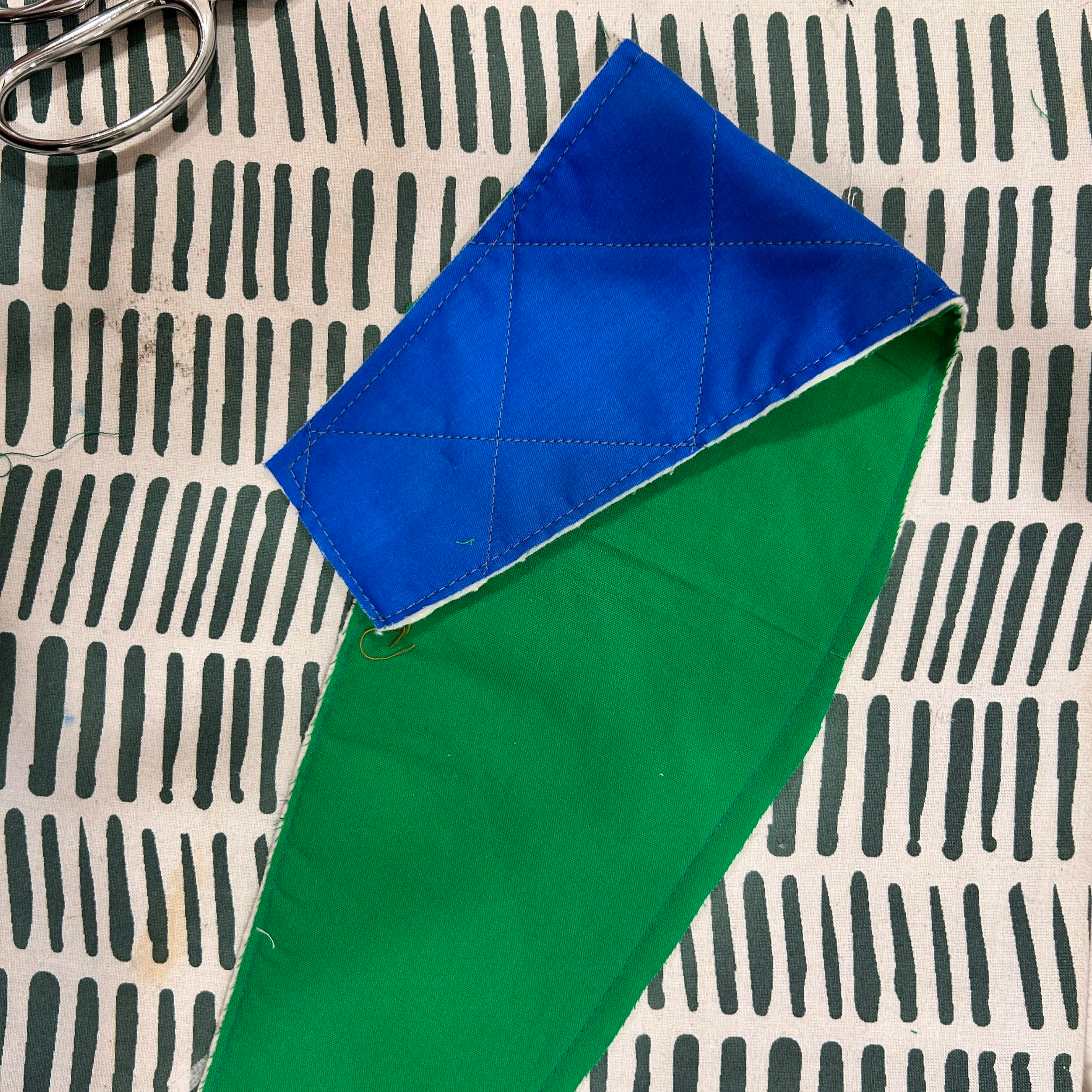 For the side panel stay stitch the lining to the main fabric. This is to keep it in place when sewing the bag. Trim any overhang or excess to ensure a clean seam.